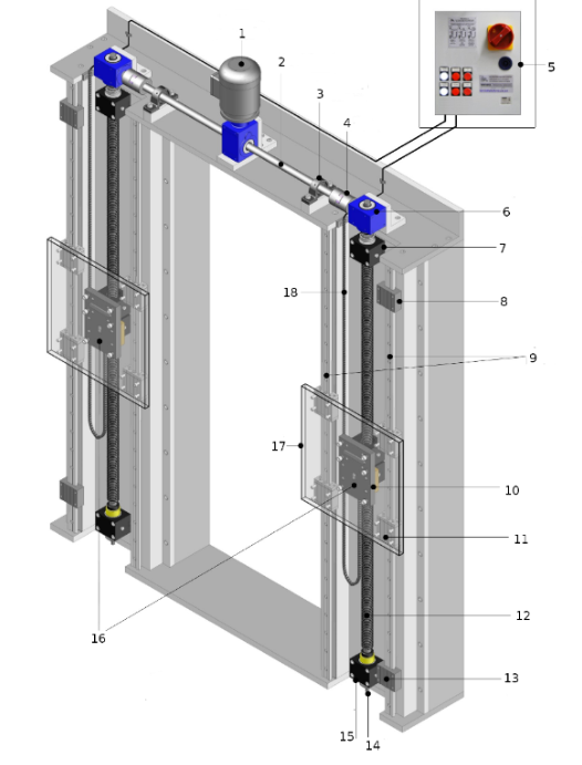 1: Motoriduttore a vite senza fine 2: Albero centrale 3: Supporto UCP 4: Giunto 5: Quadro QSU di segnalazione usura chiocciole portanti 6: Rinvio angolare o riduttore 7: Supporto fisso DVA con cuscinetti a rulli conici 8: Supporto regolabile per i finecorsa 9: Rotaie 10: Base distanziale con supporti mobili LVW con segnalatore elettrico di usura della chiocciola portante. 11: Pattini a sfere 12: Vite trapezia 13: Supporto regolabile per i finecorsa 14: Predisposizione per montaggio encoder 15: Supporto fisso DVB con molle di tensionamento 16: N.2 Gruppi Compact Safety art.C/DVAB+LVW...(R)(L) 17: Carrello mobile 18: Catena portacavi |