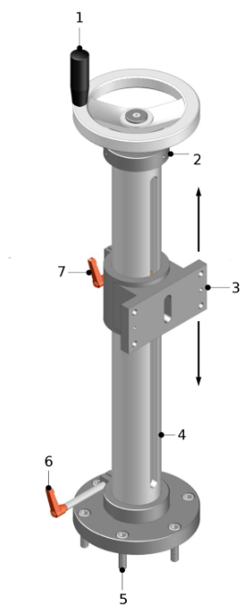 1:Volantino per movimentazione 2: Supporto superiore 3: Supporto mobile orientabile a 360° unitamentealla colonna 4:Colonna cilindrica con cava di guida 5: Bulloneria di fissaggio 6: Supporto inferiore con bloccaggio colonna 7: Sistema di bloccaggio con maniglia a ripresa |