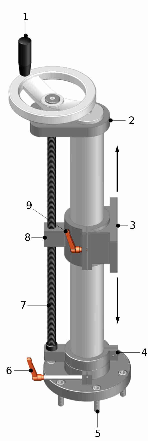 1:Volantino per movimentazione 2: Supporto superiore 3: Supporto mobile orientabile a 360° unitamentealla colonna 4: Supporto a mensola 5: Bulloneria di fissaggio 6: Supporto inferiore con bloccaggio colonna 7: Vite trapezia 8: Chiocciola fissata al supporto mobile 9: Sistema di bloccaggio con maniglia a ripresa |